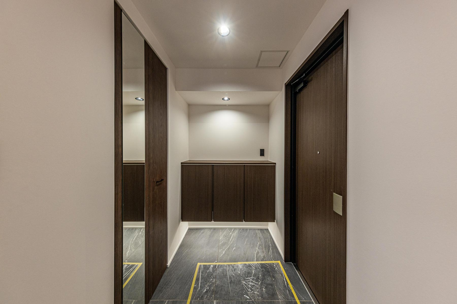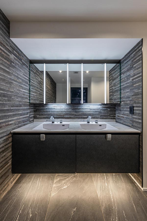 玄関からホール、水回りの床には繋がりのある大判タイルを使用して上質な統一感をプラス。
