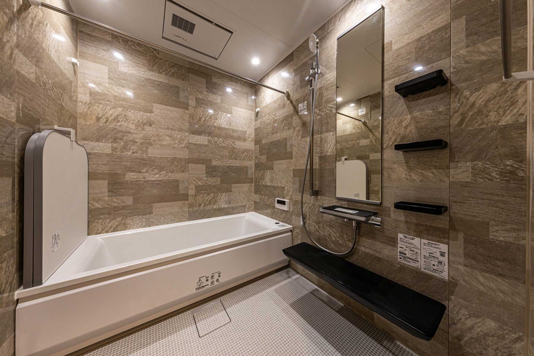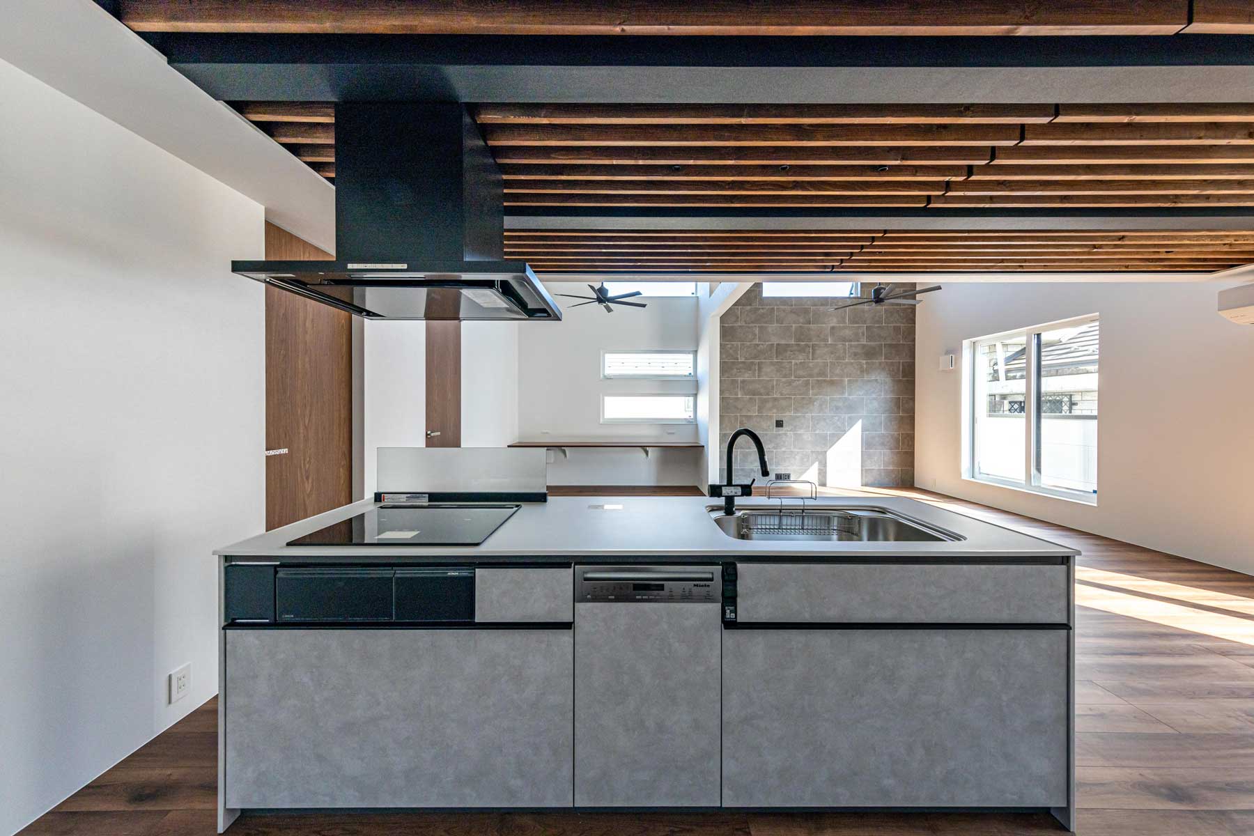 キッチンは木格子のルーバー天井が重厚感とぬくもりを感じさせ、集いの中心となるアイランド型を採用。料理や会話、配膳までスムーズに行える家事動線で、ストレスフリーな毎日を叶えます。大容量食洗機も備え、機能美と快適性を両立しました。