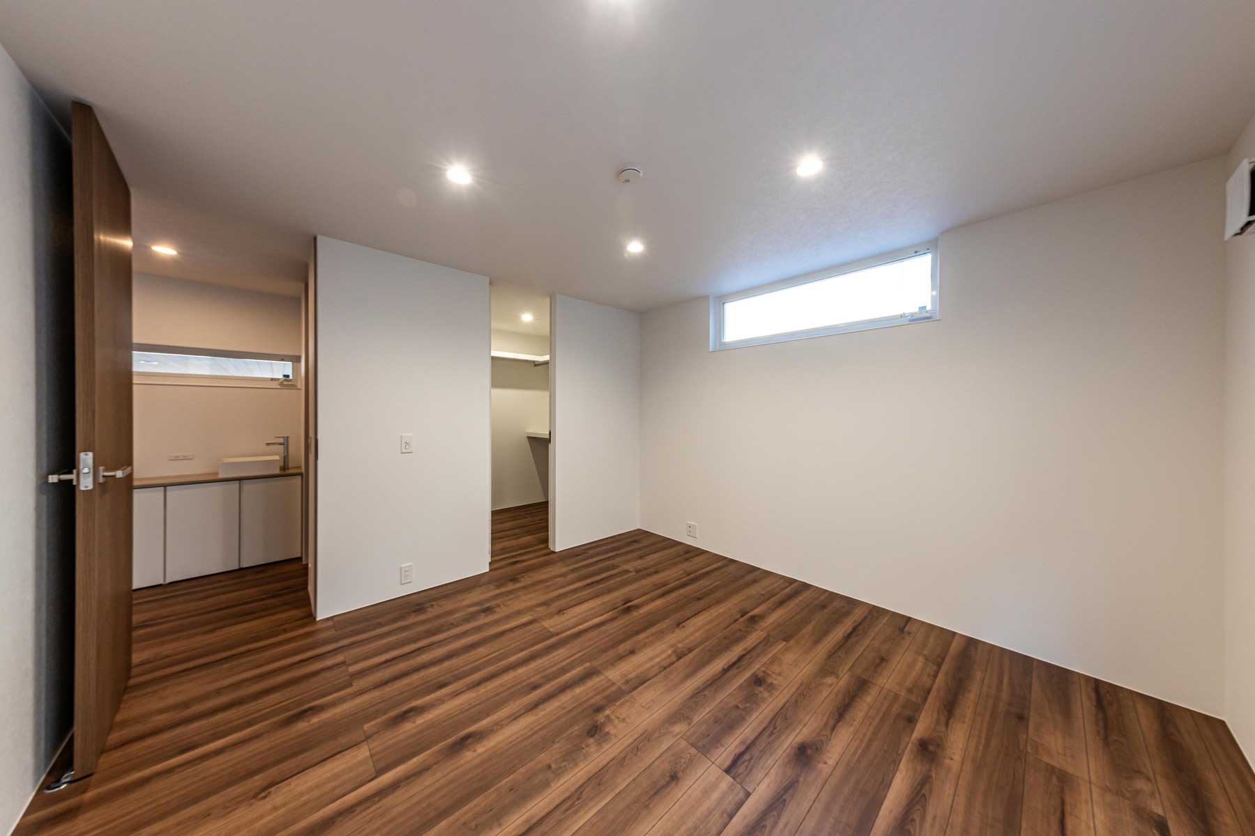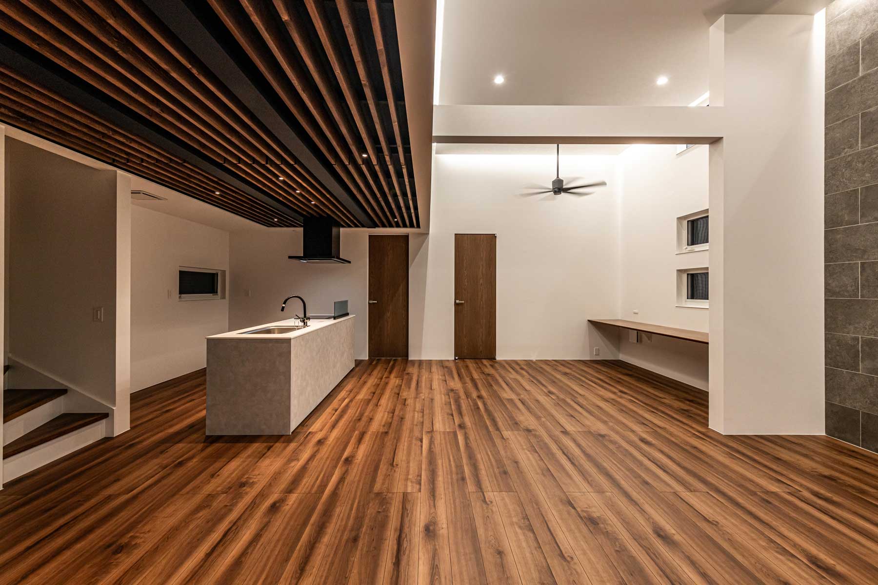 リビングは高窓から柔らかな自然光を取り込み、外からの視線を遮りながら開放感を実現。アクセントタイルと間接照明が洗練された雰囲気を演出し、シーリングファンやカウンターのコンセントなど、快適な暮らしを支える工夫も随所に。約3.6mの吹き抜けが広がりをもたらし、光と風に包まれる心地よい大空間です。