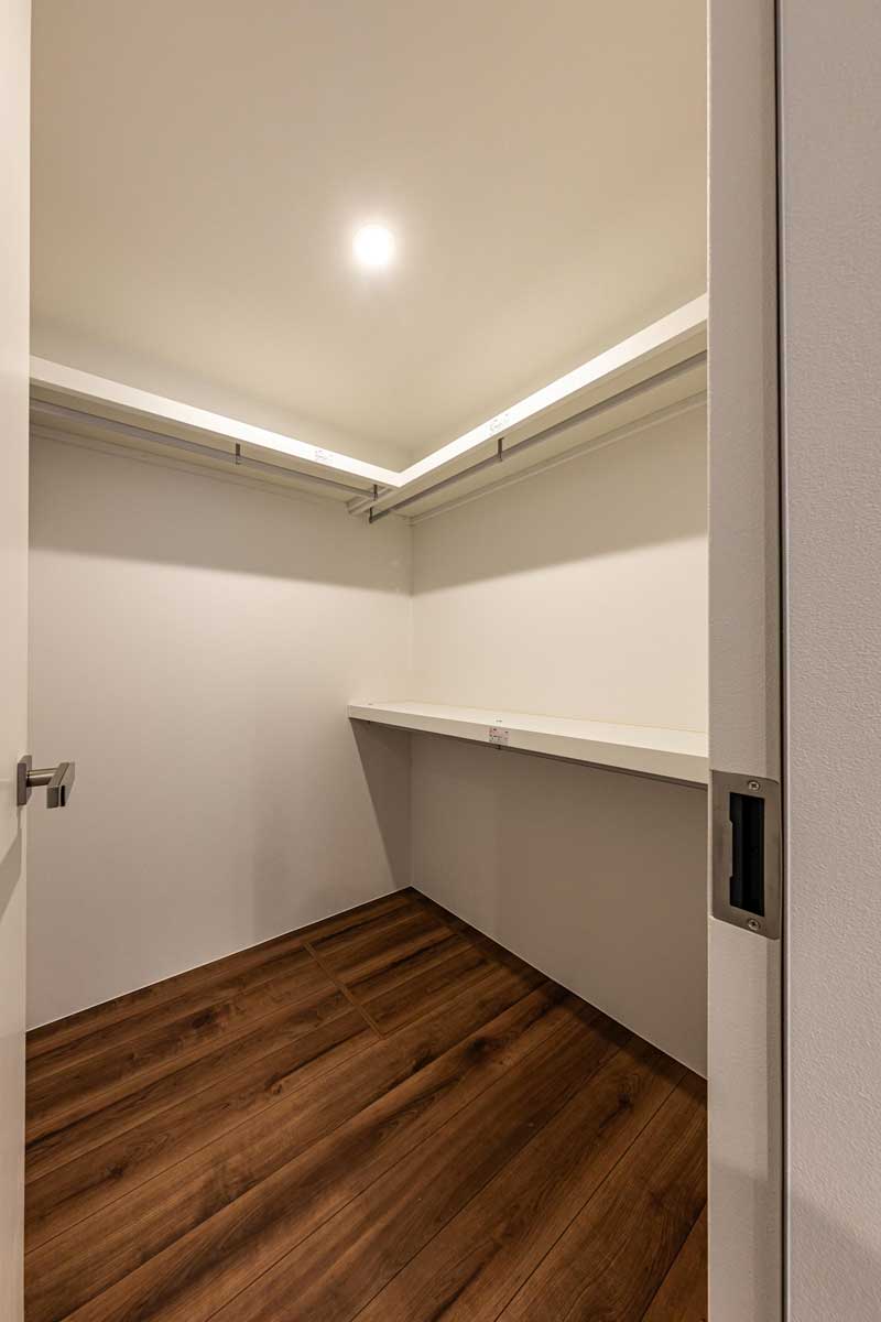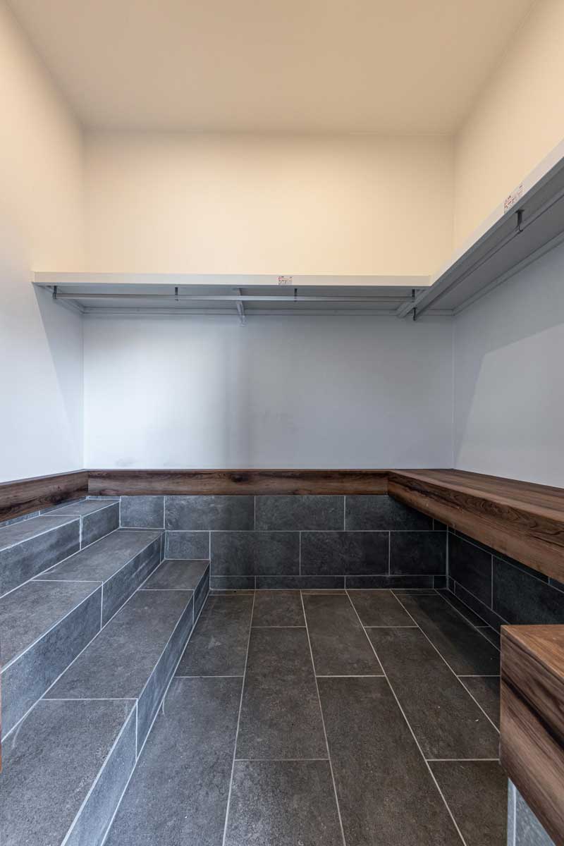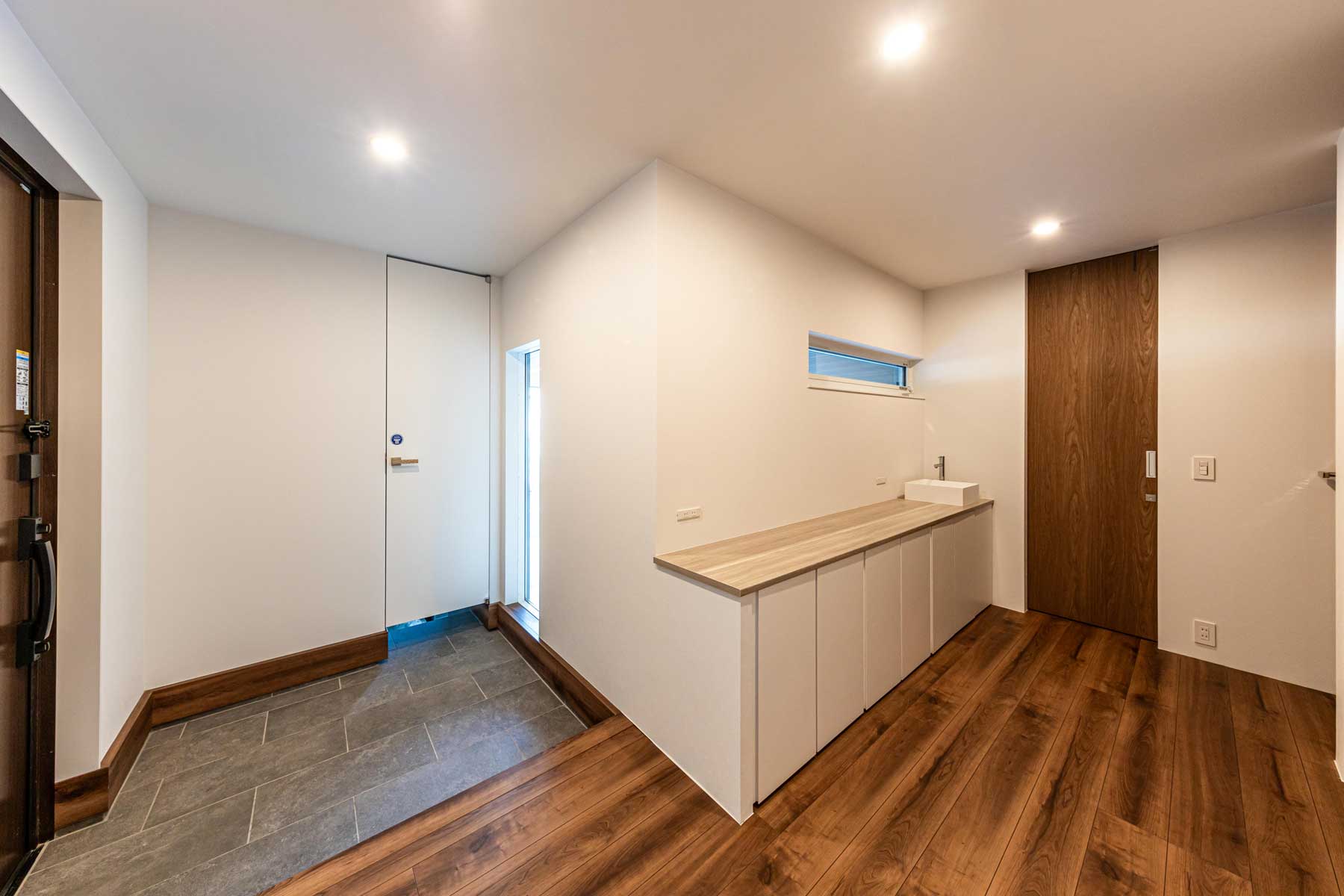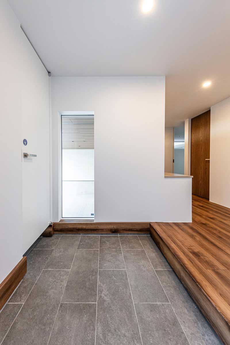 玄関は間接照明が足元をやさしく照らし、グレーのタイルが上品に広がる洗練空間。ガレージへと続く動線は機能性とデザイン性を兼ね備え、さらにポールハンガーを備えることで実用性も高めています。