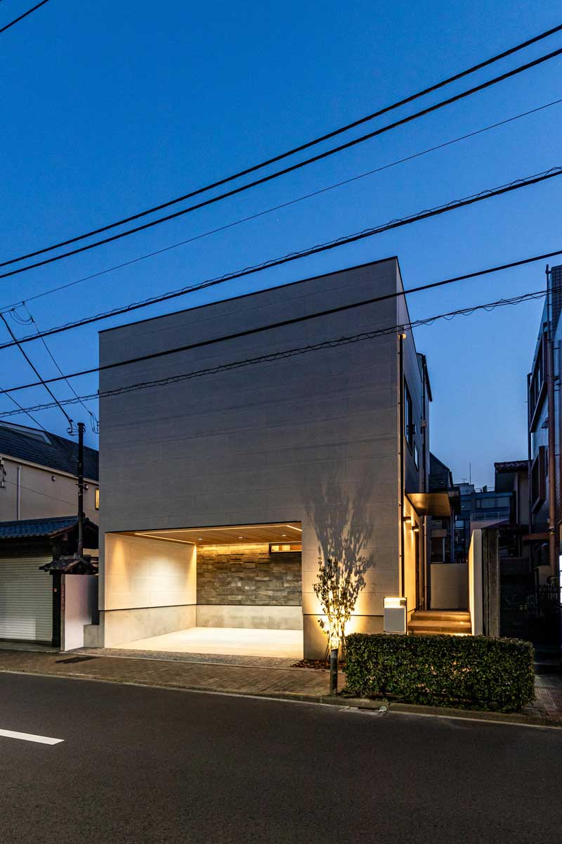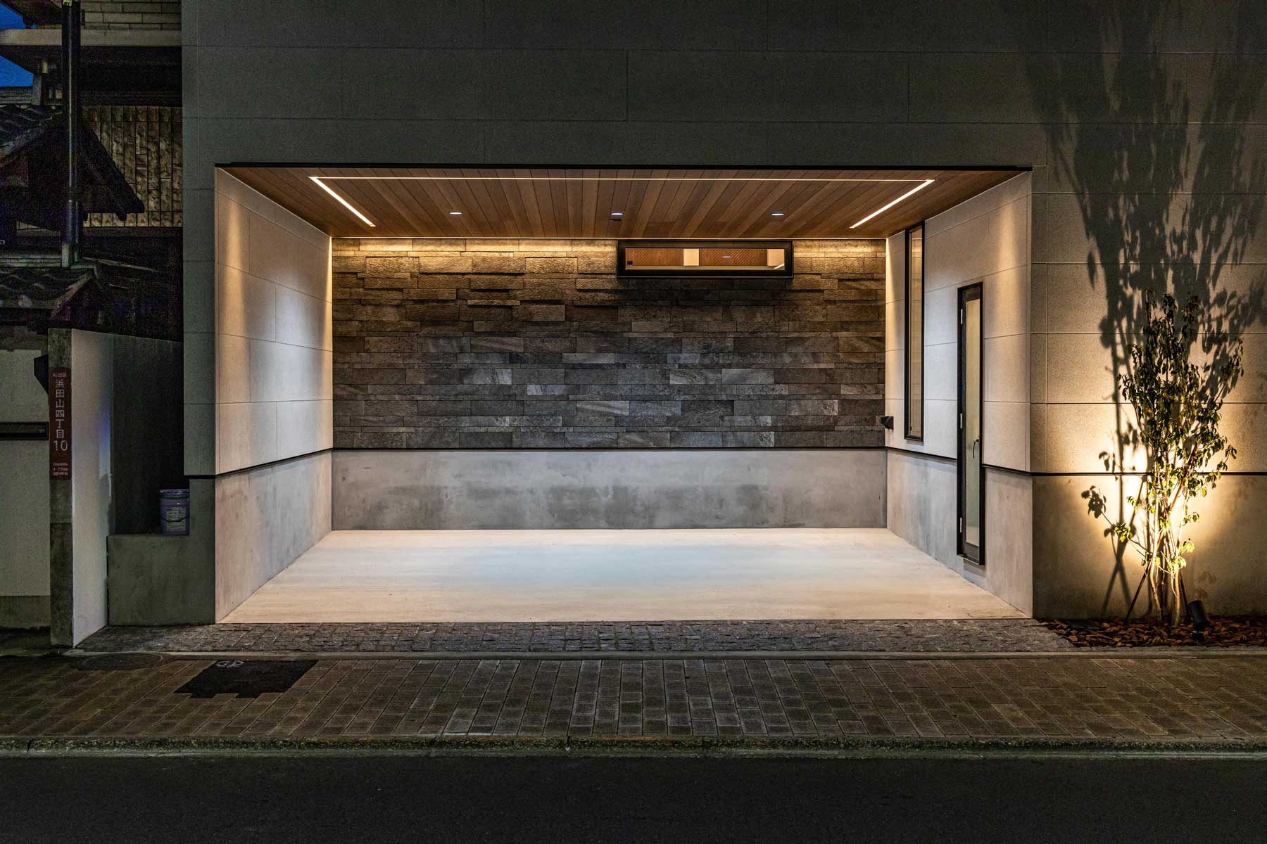 外観は、車庫奥にあしらわれた上質なタイルと木目調の天井が温かみを添え、埋め込み式LED照明や足元のスポットライトが昼夜で異なる表情を演出。草木の美しさを際立たせるこだわりのデザインです。