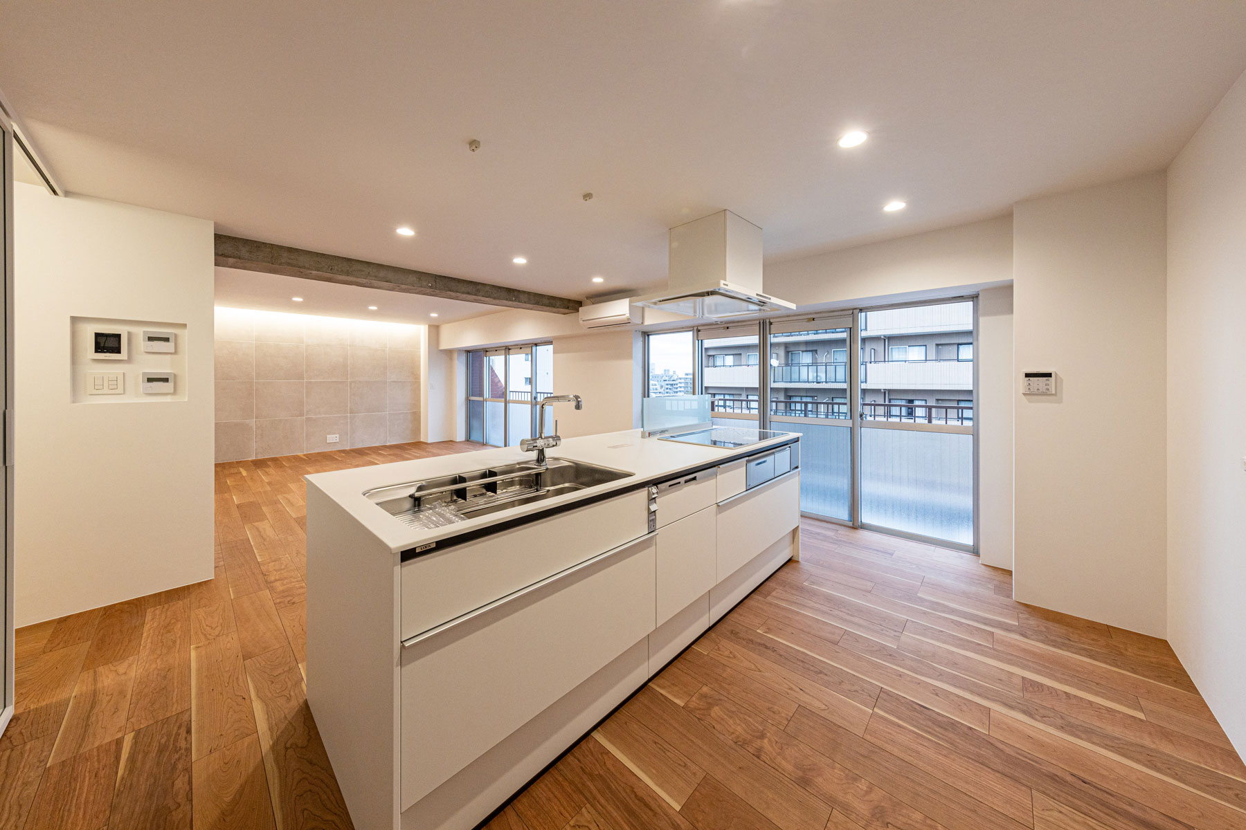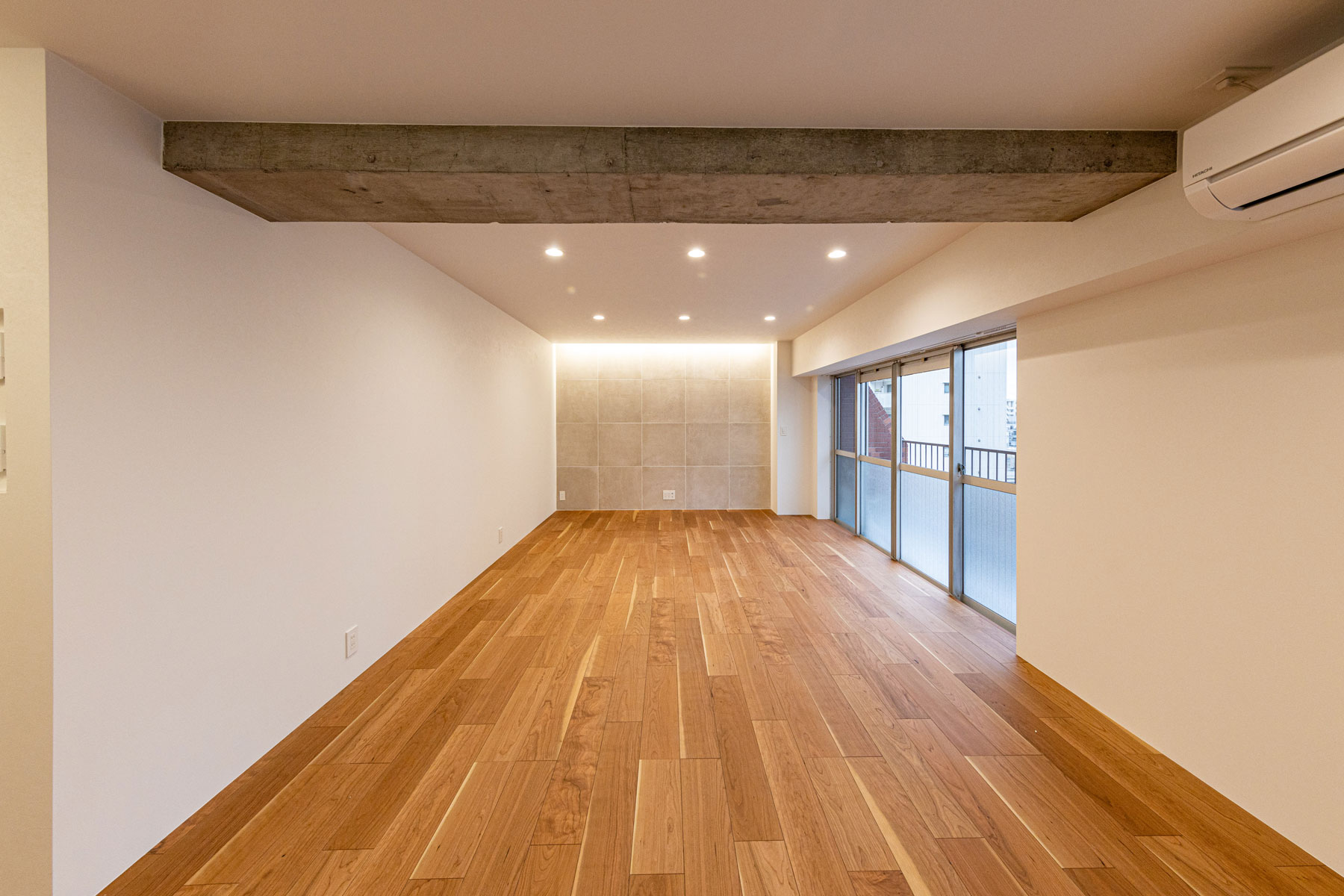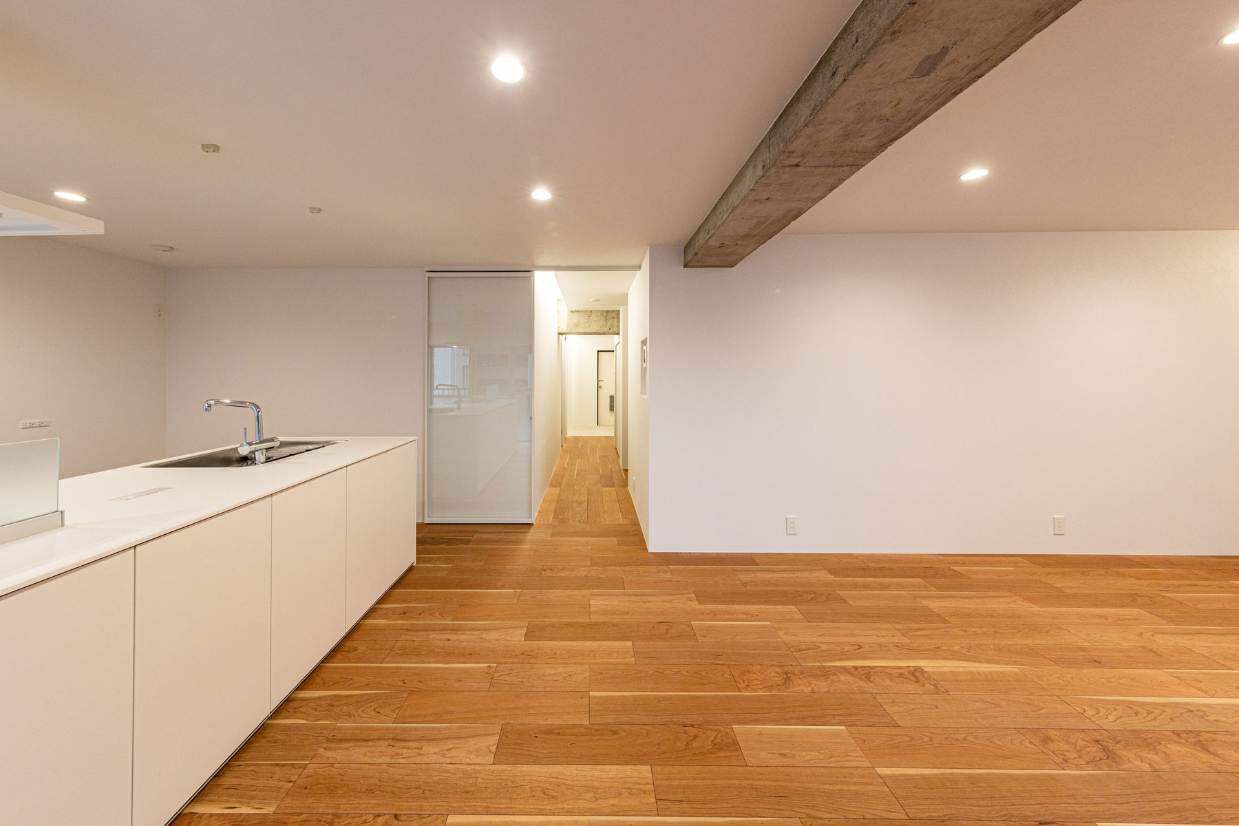 リビングへ向かう廊下とリビングにはあえて梁の一部を表しのまま残し、アンティーク感がエッセンスとなっています。