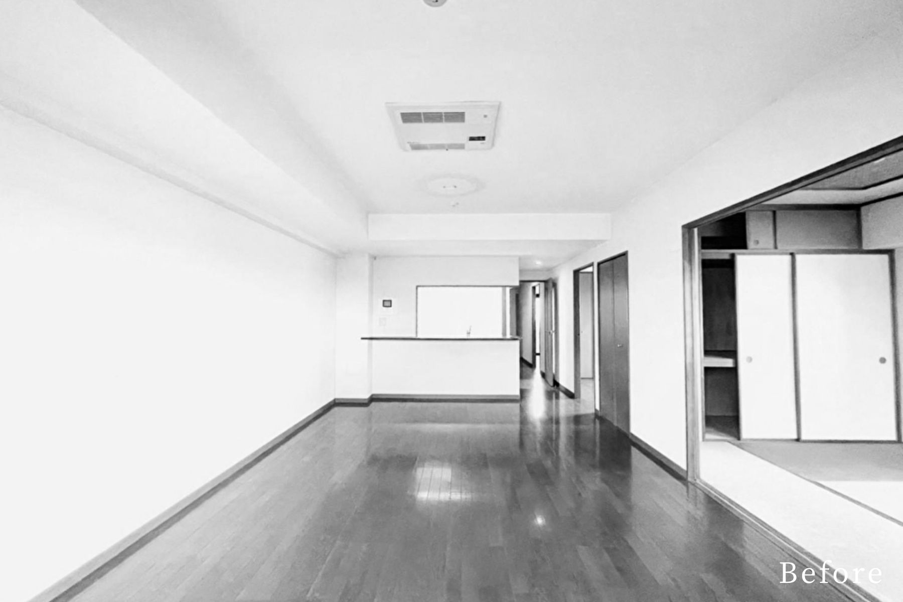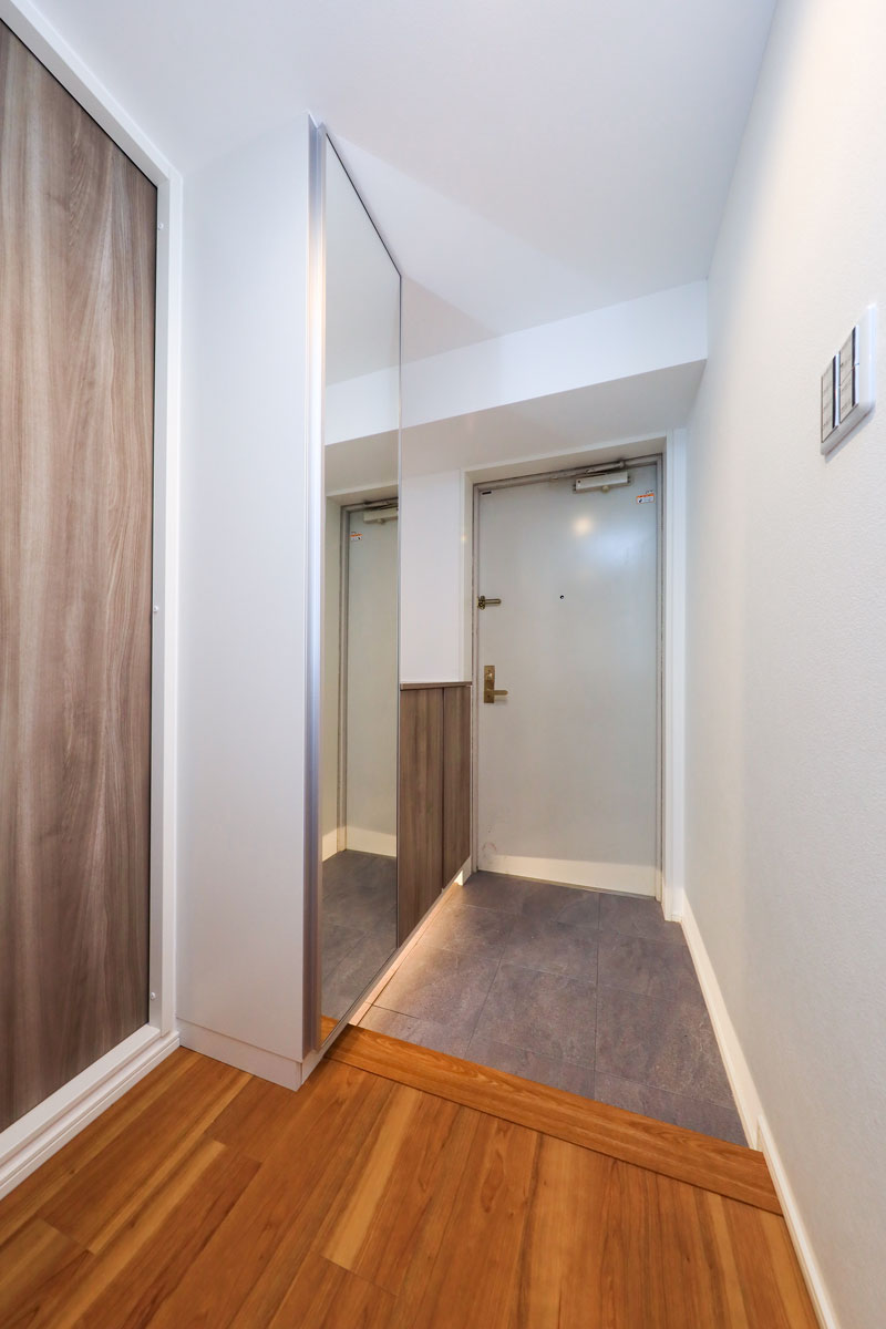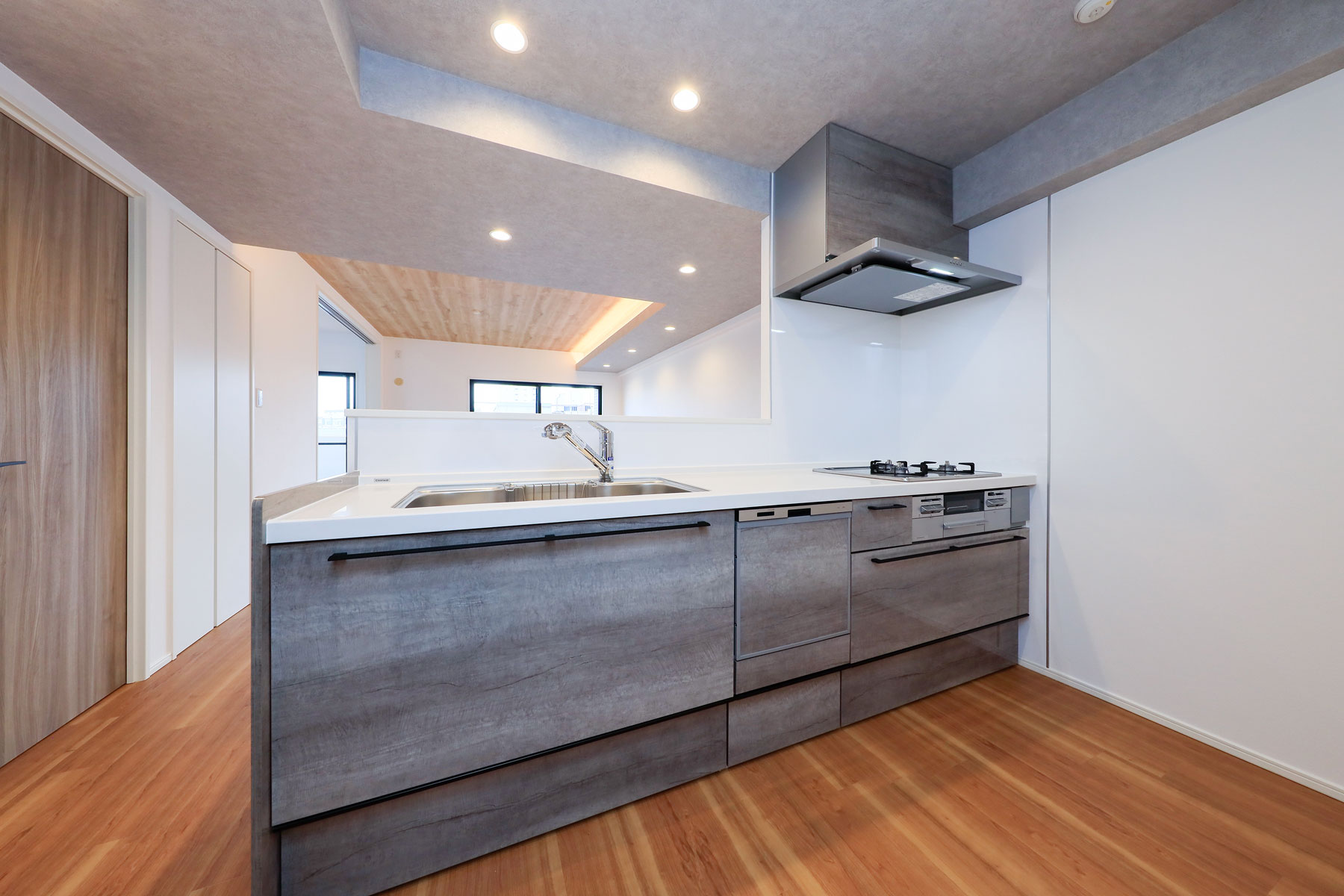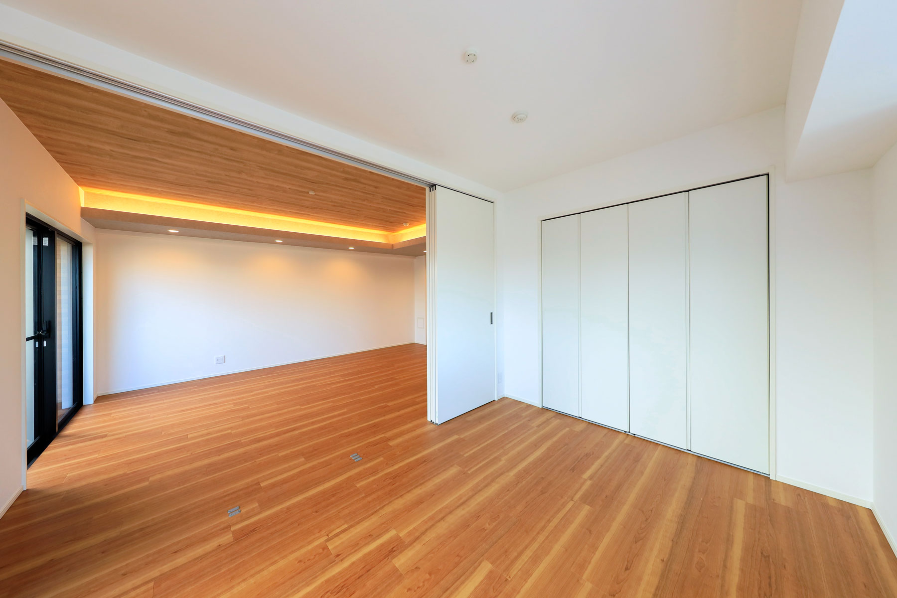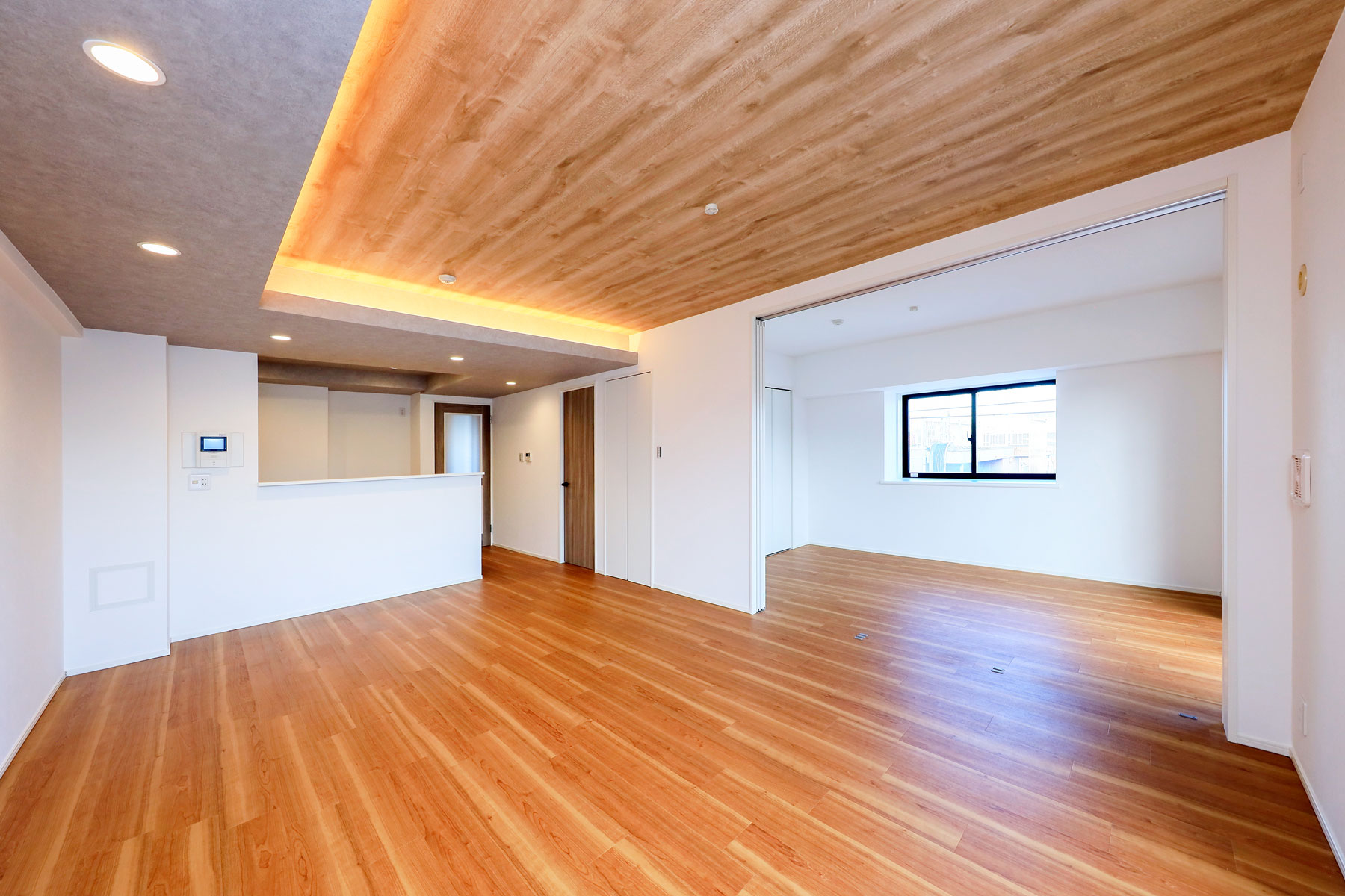 LDKに入ると、木目を進行方向の長手に流したフローリングが視線を導き、奥行きのある空間を演出します。折り上げ天井に施された間接照明がやわらかにゾーンを区切り、特別な癒しのひとときを感じられる設計に。隣接する洋室を開放すれば、一体的に利用できるフレキシブルな居住空間が広がります。