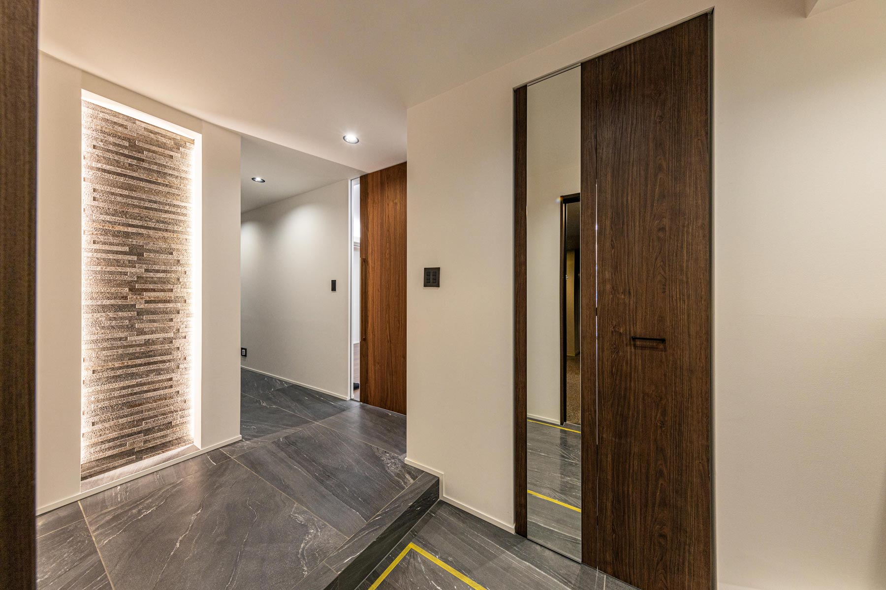 玄関からホール、水回りの床には繋がりのある大判タイルを使用して上質な統一感をプラス。