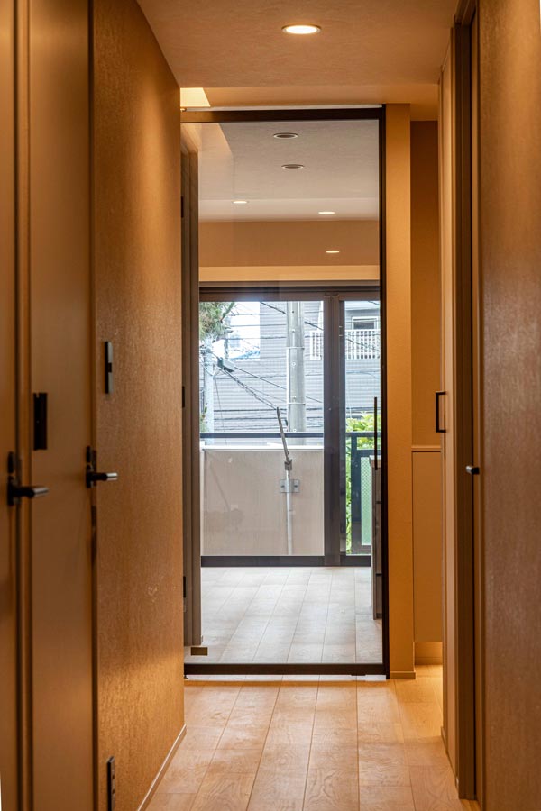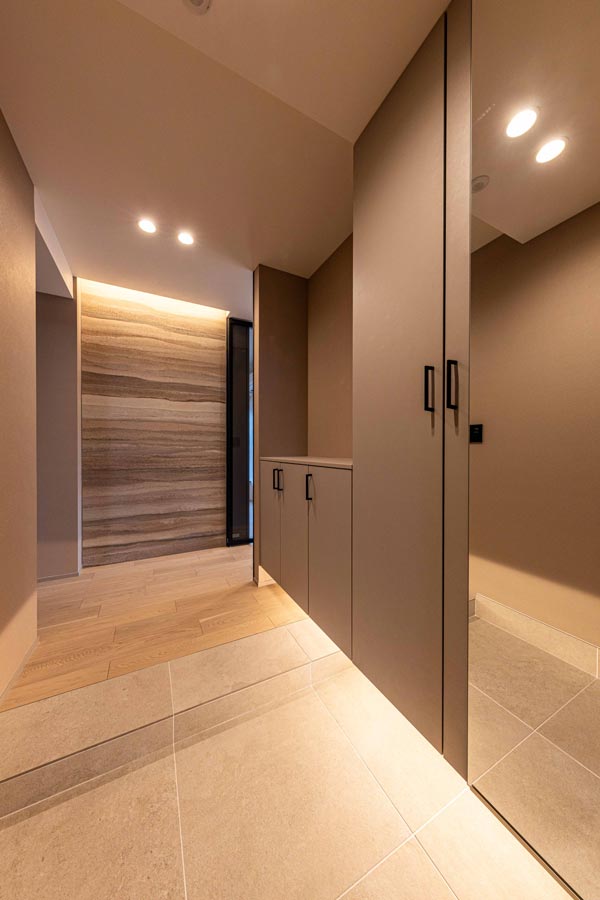 玄関を開けるとまず目を奪うのは、左官職人の手仕事を思わせる版築風のアクセントウォール。磁器タイルで巧みに再現された意匠に、足元からの間接照明が陰影を与え、奥行きと落ち着きをもたらします。リビングへと続くクリアガラスのハイドアが、空間のつながりと開放感を演出します。