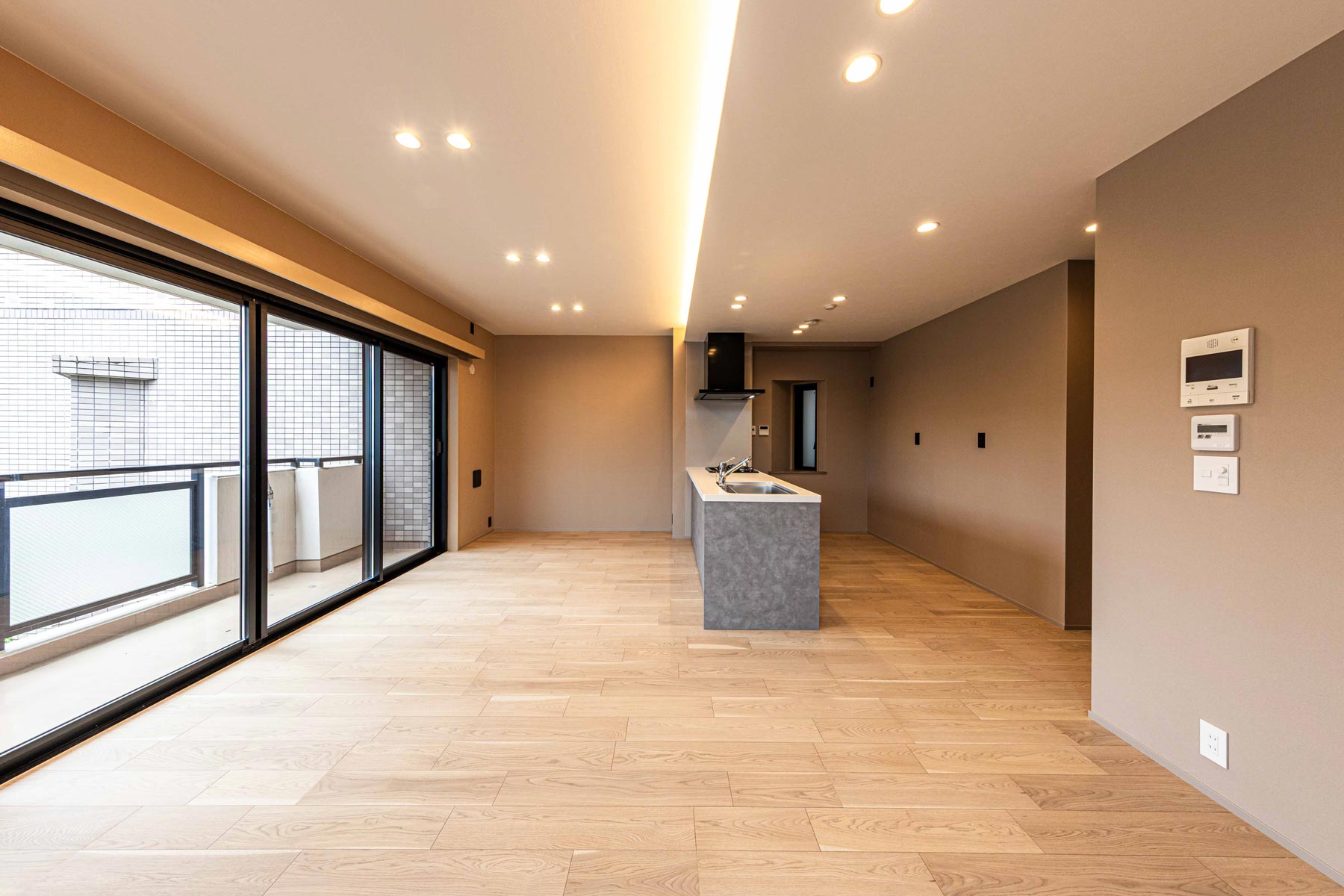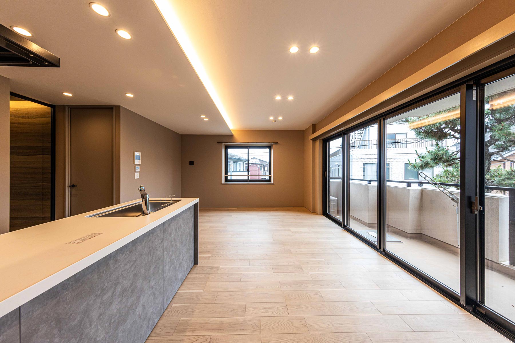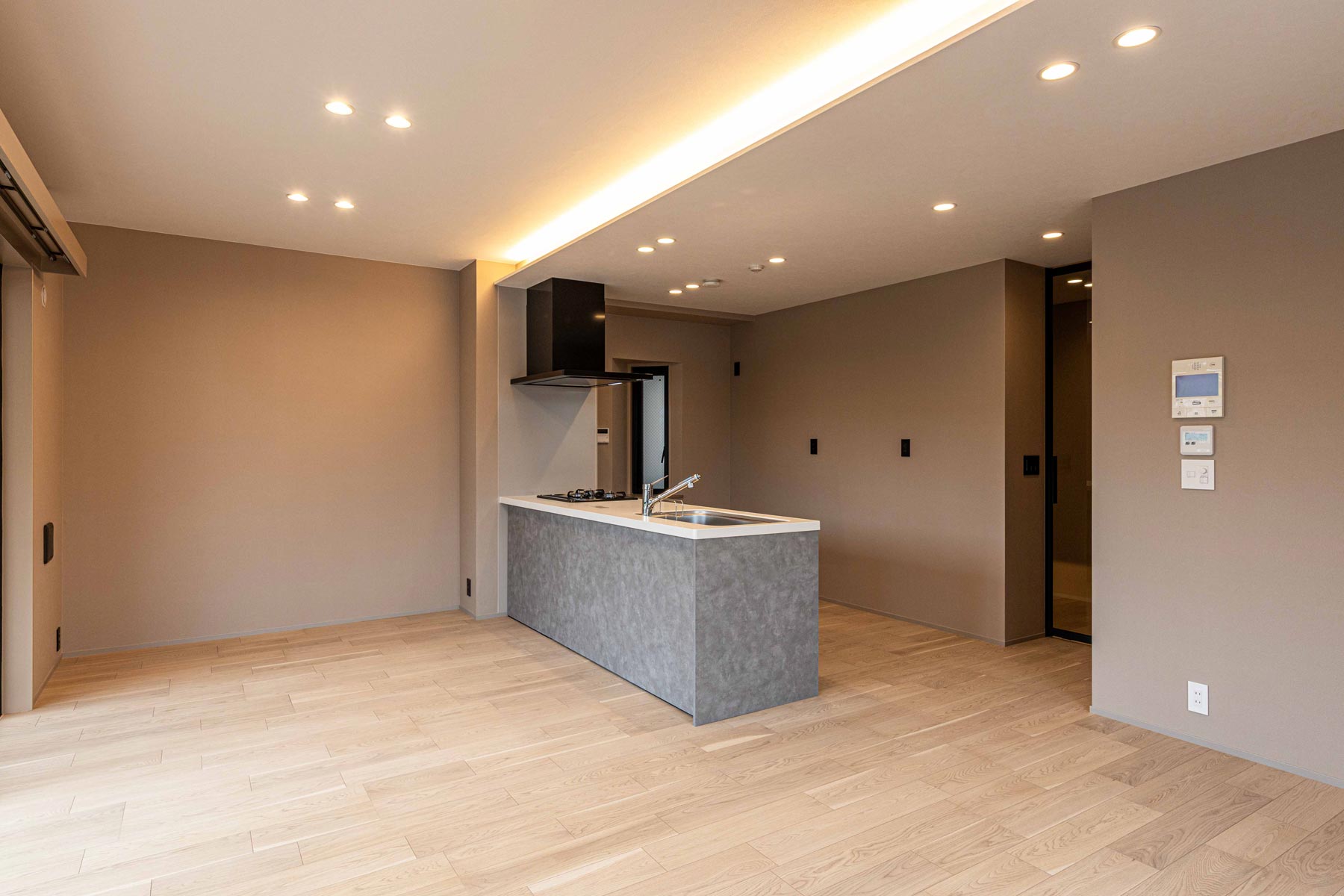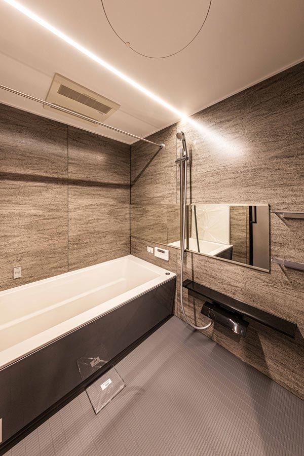 18帖のリビングダイニングは、床暖房が3面に広がり、包み込まれるような温もりを実現。上質な間接照明がホテルライクな雰囲気を漂わせ、日常を特別な時間へと変えてくれます。