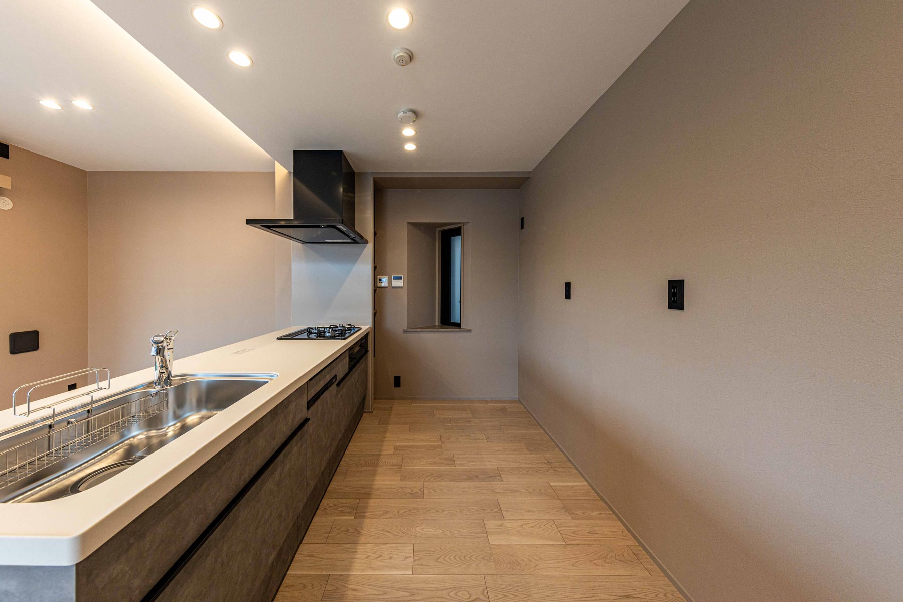 キッチンはリビングと調和するグレージュトーンのカウンタータイプ。落ち着きある色合いが空間を上質にまとめ、食洗機を備えるなど機能面も充実。美しさと利便性を兼ね備えた設計です。