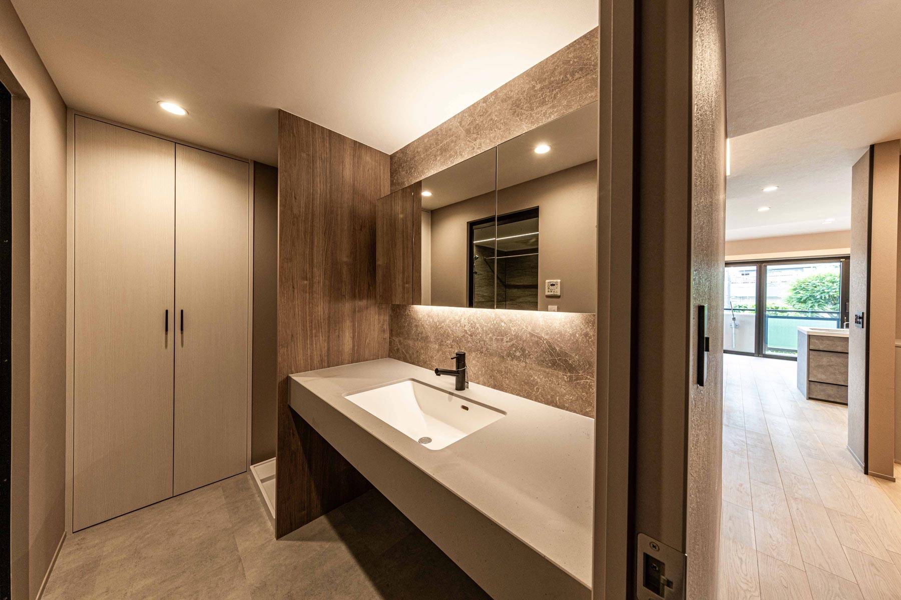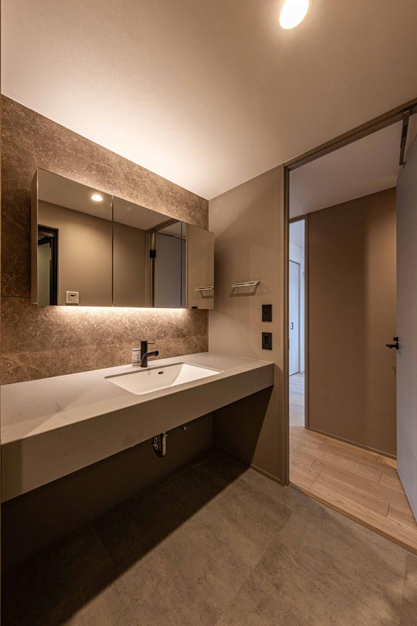 独立洗面台もまた、空間全体と調和する落ち着きあるデザイン。木目と照明が織りなす温かな雰囲気の中で、朝の身支度から夜のリラックスタイムまで快適に過ごせる空間です。
