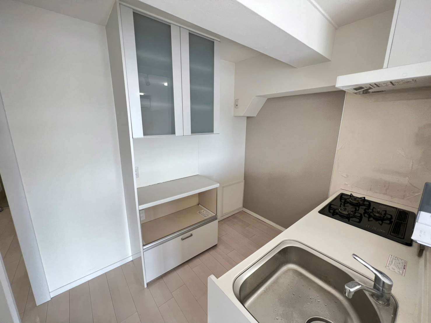 キッチンは、コンパクトながらもカウンターを設置。料理や食事の場として活用できるほか、空間のアクセントにもなっています。