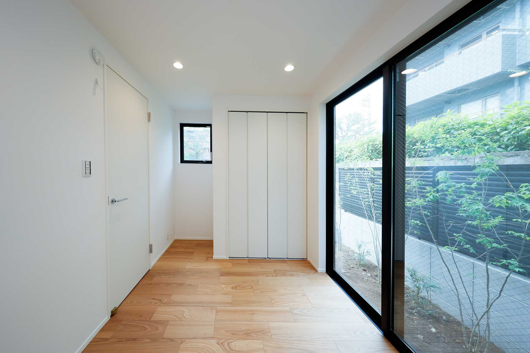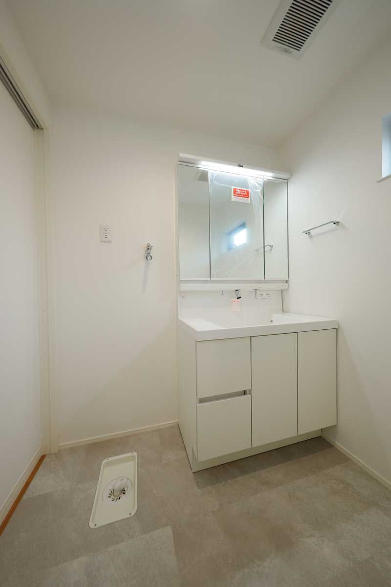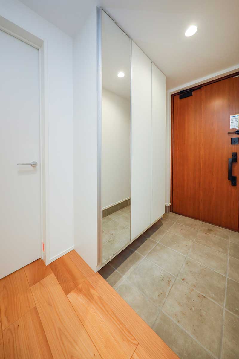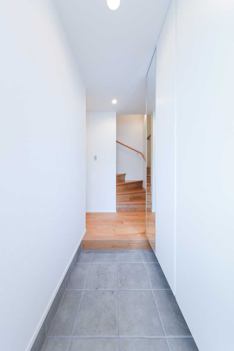 外観はホワイトを基調としたシンプルで落ち着いたデザイン。玄関には雨よけの屋根を設け、植栽の緑を添えることで、上品さとやさしい雰囲気を演出しています。玄関内部はホワイトとグレーを基調にスタイリッシュに仕上げ、鏡付きのシューズボックスを備えることで、身支度をスムーズに整えられる実用的な空間です。