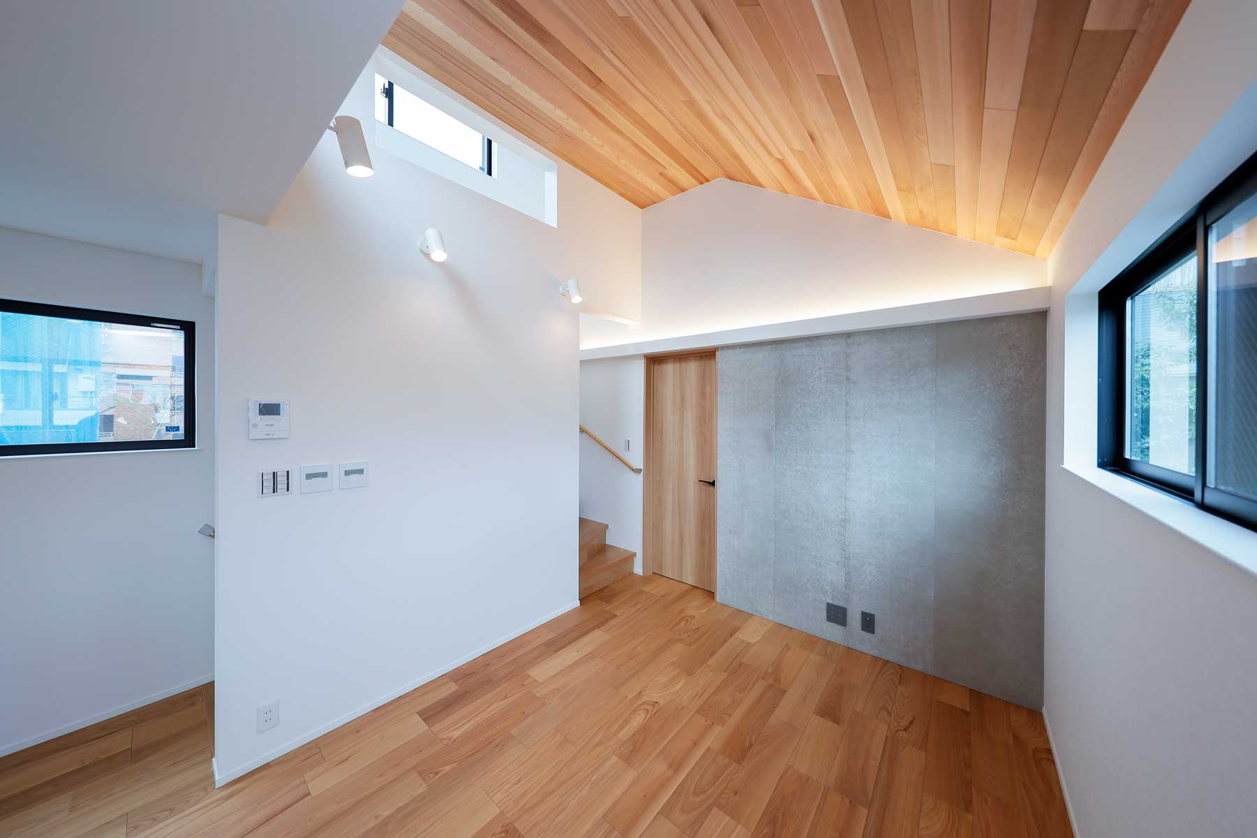 リビングは天井高を活かした開放的な空間に、小窓を多く設けて自然光をたっぷりと取り込みます。天井の間接照明が木材に反射し、温かみのある柔らかな印象を与え、昼も夜も心地よい雰囲気を楽しめます。