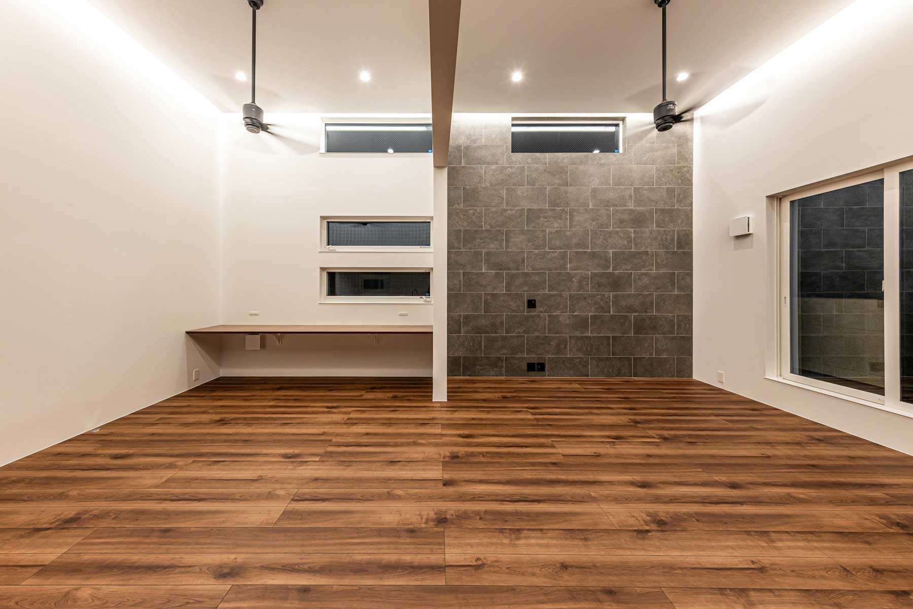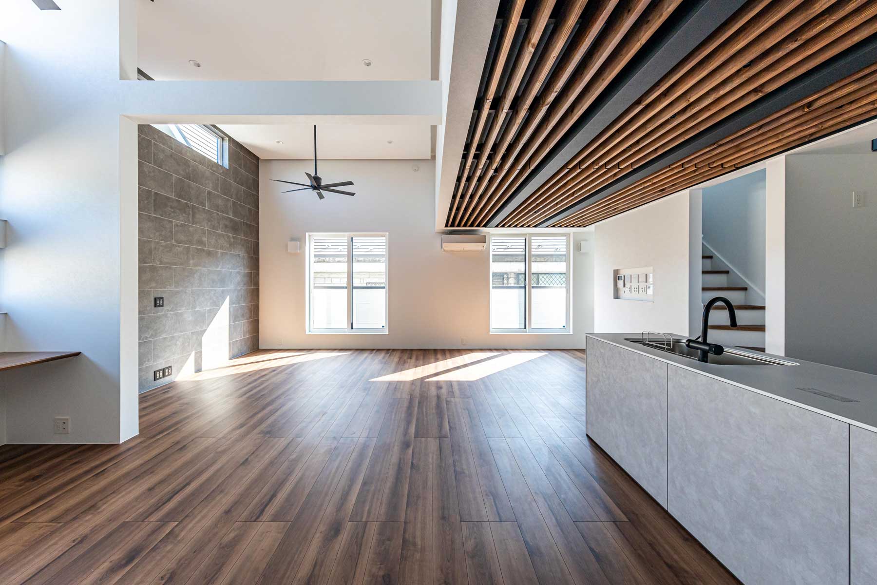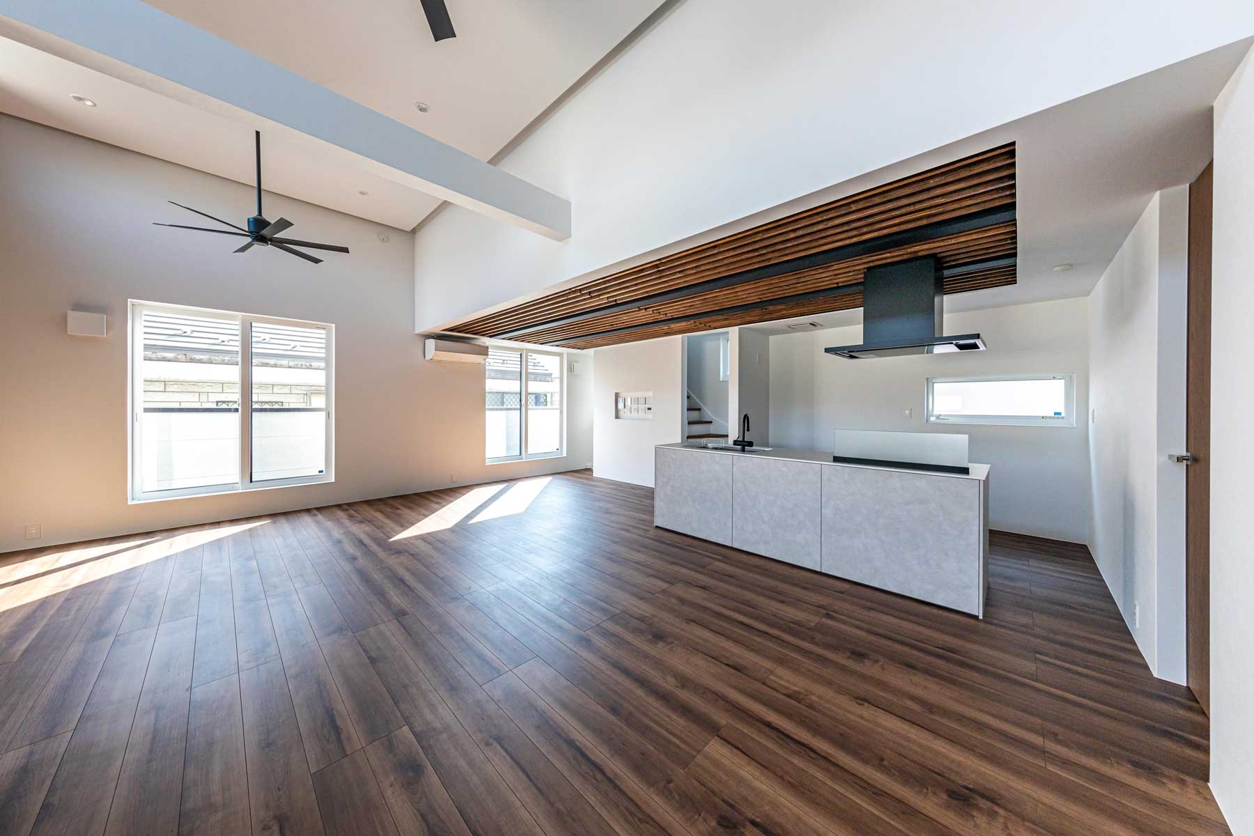 リビングは高窓から柔らかな自然光を取り込み、外からの視線を遮りながら開放感を実現。アクセントタイルと間接照明が洗練された雰囲気を演出し、シーリングファンやカウンターのコンセントなど、快適な暮らしを支える工夫も随所に。約3.6mの吹き抜けが広がりをもたらし、光と風に包まれる心地よい大空間です。