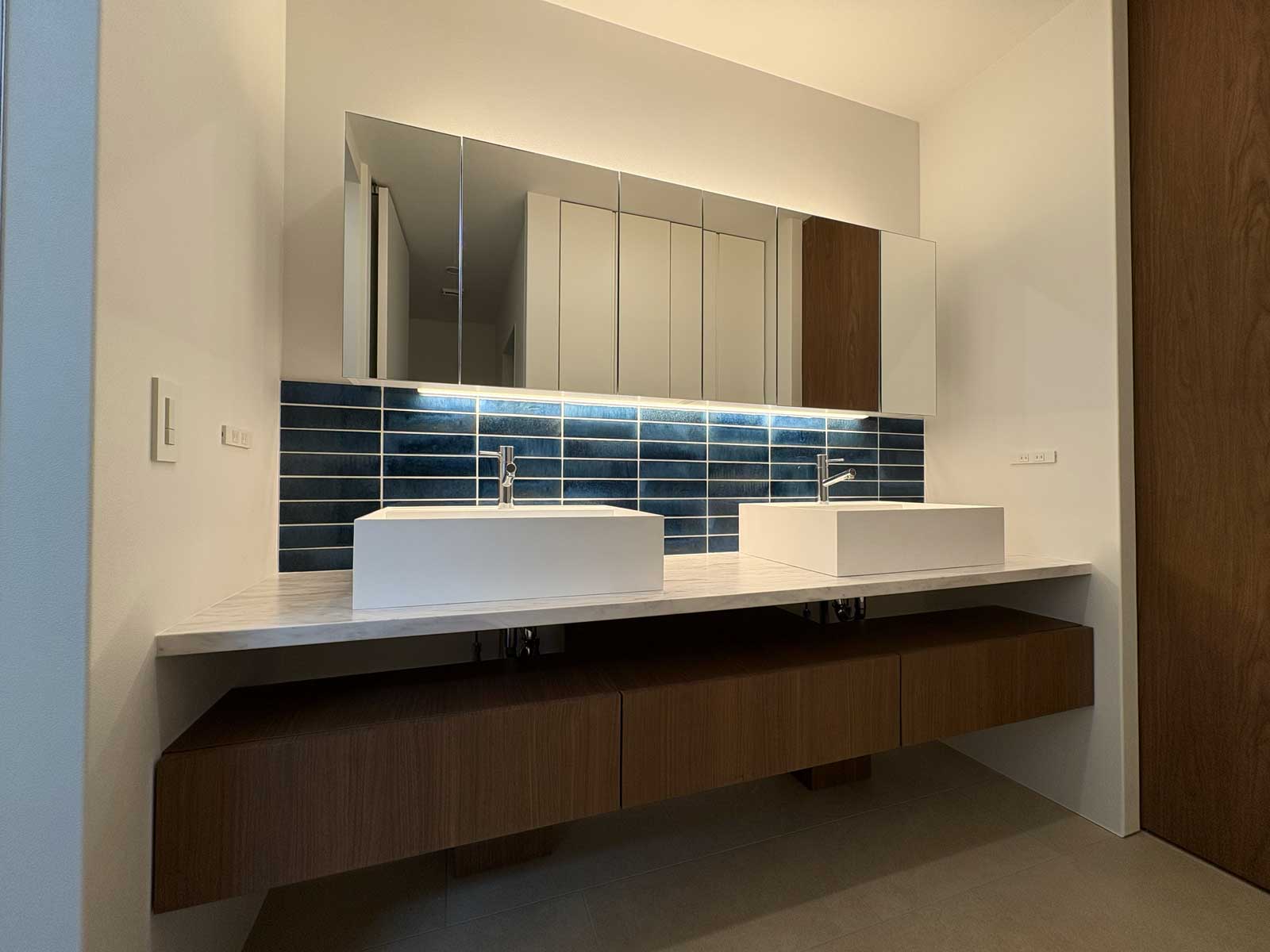 独立洗面台は2ボウル仕様で、忙しい朝も快適に。深みのある青タイルと間接照明が上質な雰囲気を醸し出し、まるで高級ホテルのような仕上がりに。造作ならではの美しさと機能性を兼ね備えた空間です。