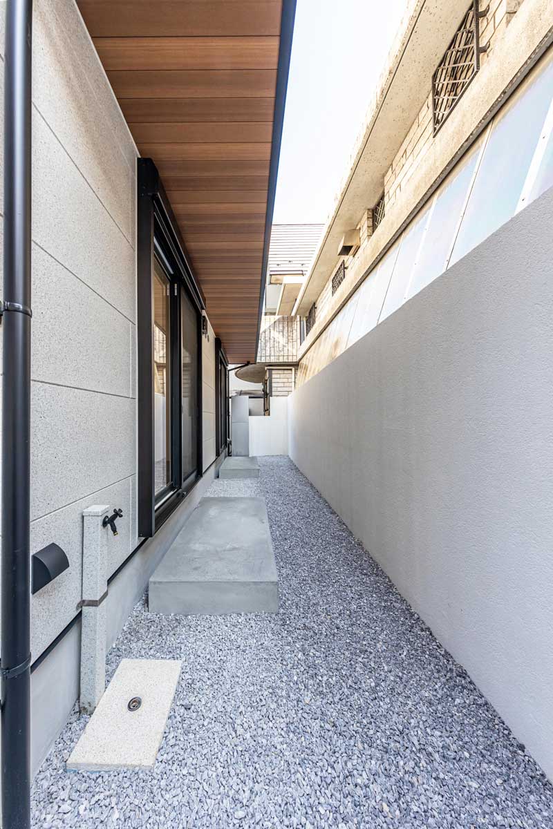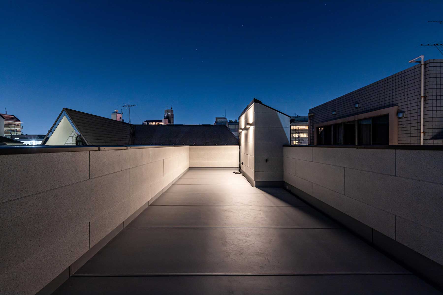 外観は、車庫奥にあしらわれた上質なタイルと木目調の天井が温かみを添え、埋め込み式LED照明や足元のスポットライトが昼夜で異なる表情を演出。草木の美しさを際立たせるこだわりのデザインです。